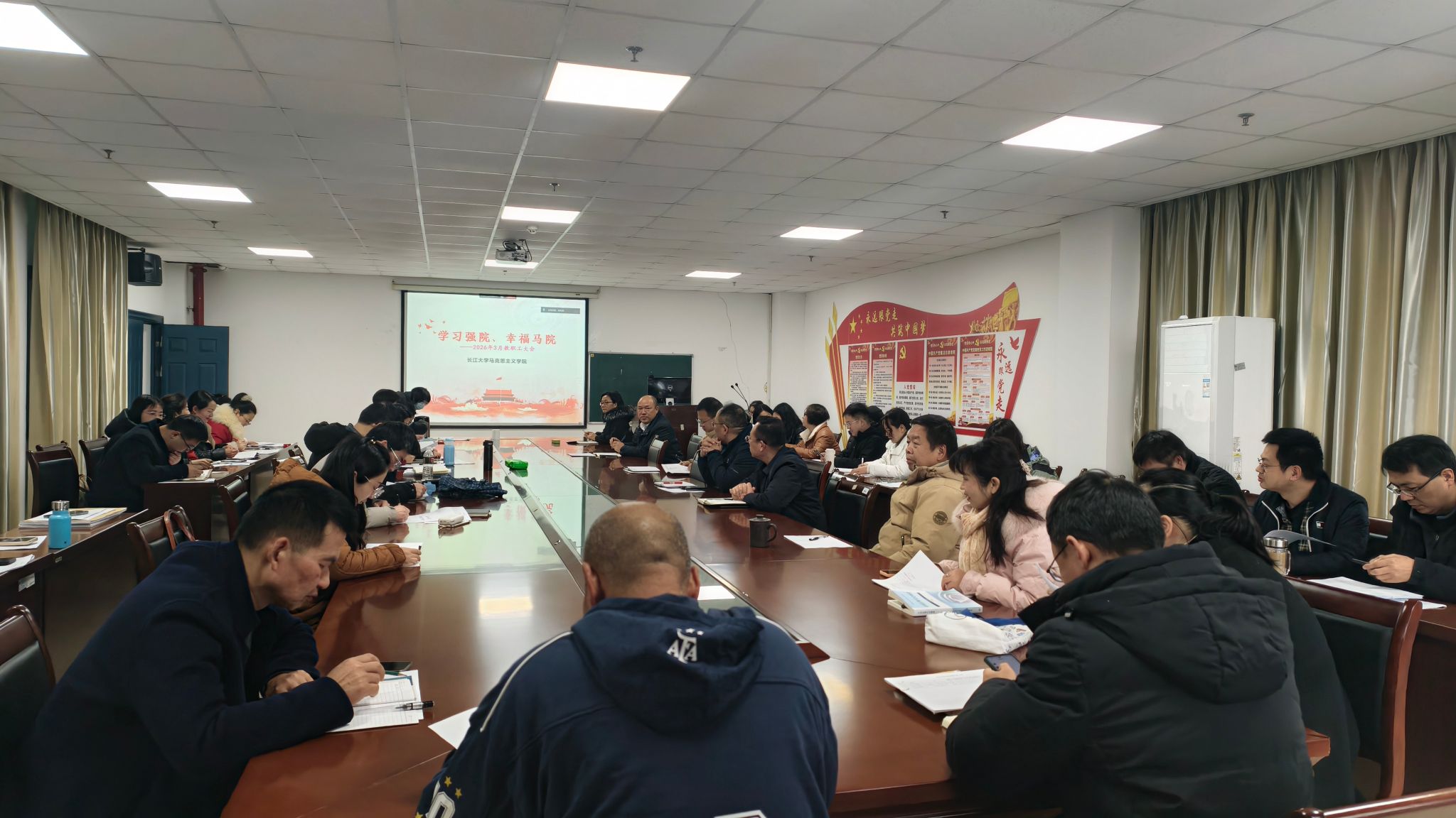 在文科楼1104室召开全体教职工大会,全面部署新学期重点工作,凝聚发展共识。会议由院长姜学勤主持,全院教职工参会。