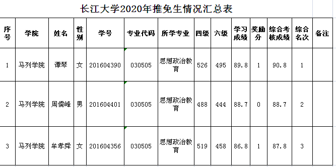 经学生本人申请、学院推免生遴选工作小组考核,现将我院2020届优秀应届本科毕业生免试攻读硕士学位研究生名单予以公示。公示时间:2019年9月19日-2019年9月21日,公示期间学生如有异议可向学院、教务处反映,如有违纪,可向学校纪委举报。联系电话:学院(0716)8060275,教务处(0716)8060580,学校纪委(0716)8060993。
