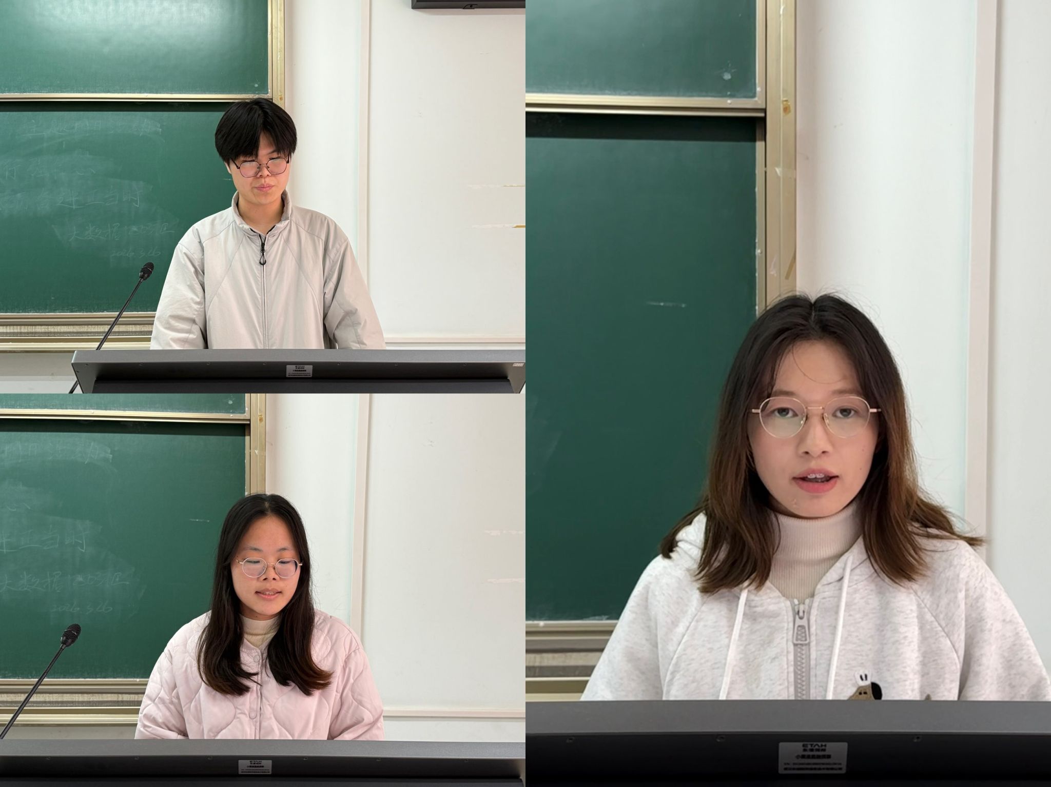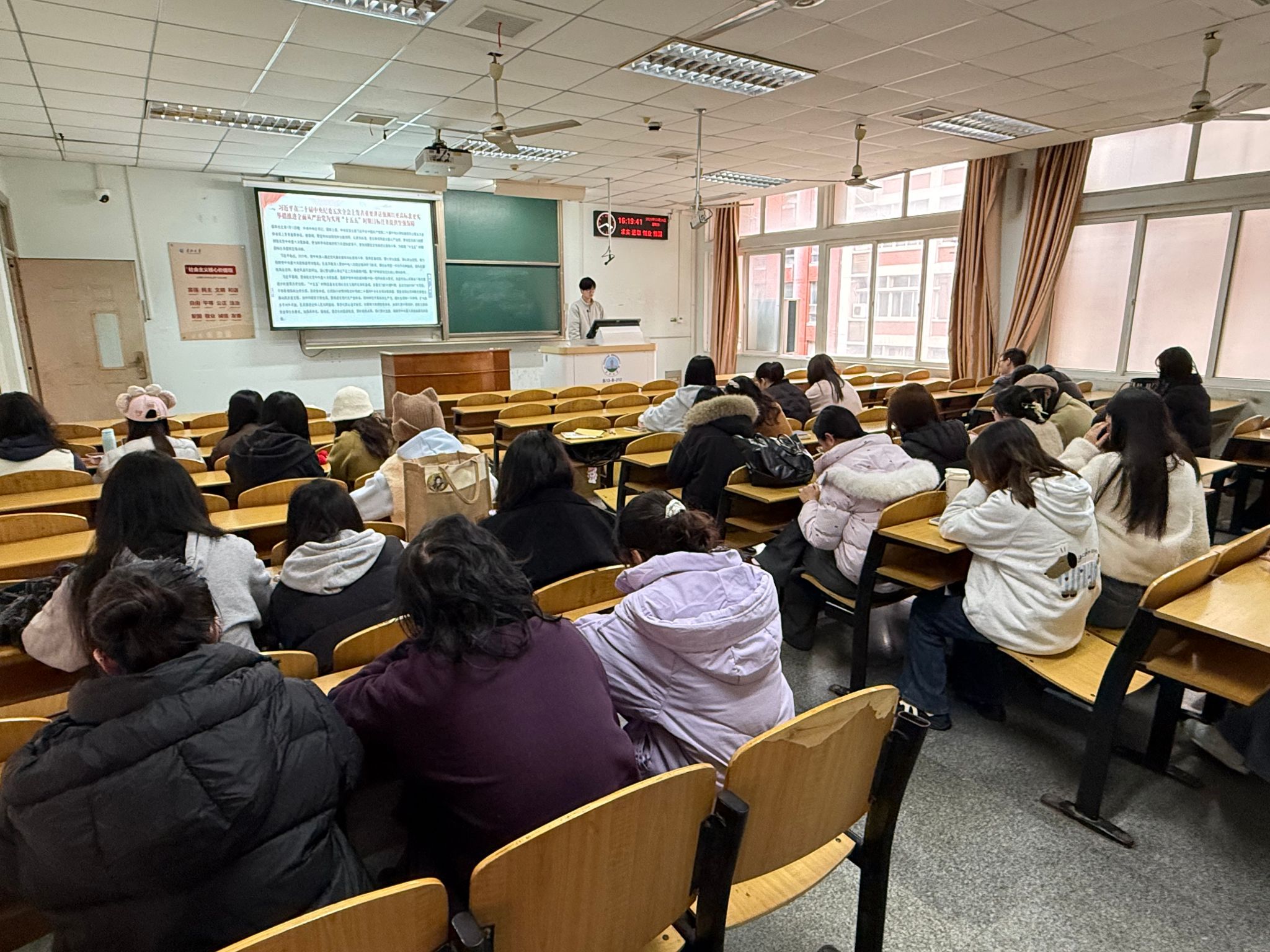 在13教-B212教室组织2025级全体研究生开展3月份政治理论学习。本次学习由郭子豪、李凯妮、陈梅芳三位同学依次主讲。